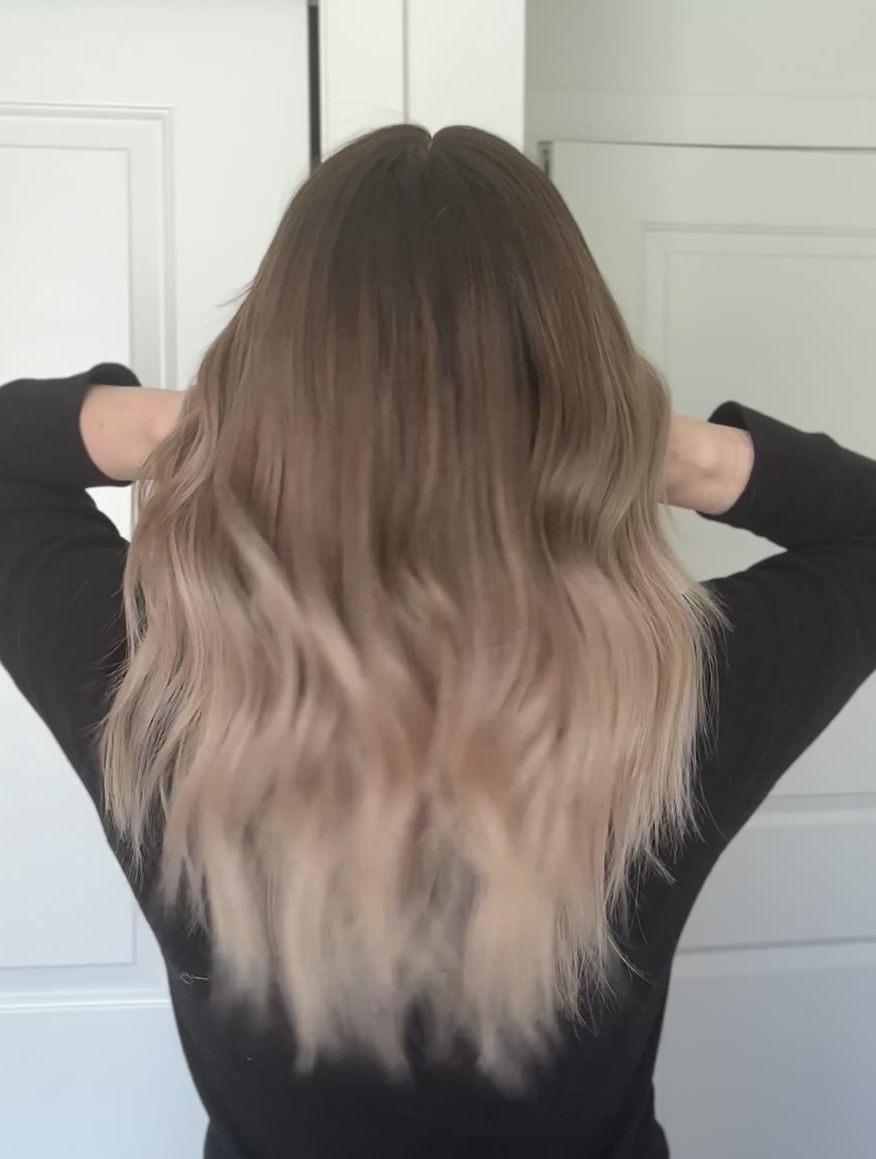 - Level 6/7 root melt blended into bright blond ends (level 9). Cool/ neutral tones.