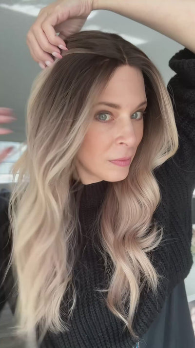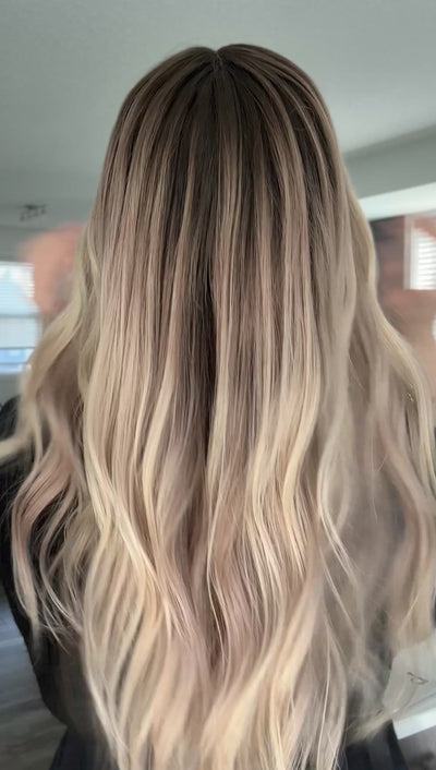 Level 6 soft root melt blended into champagne blond lengths. Multidimensional, cool champagne and soft gold undertones.