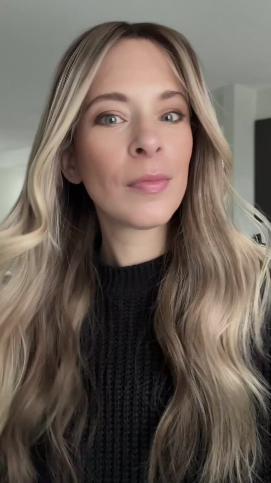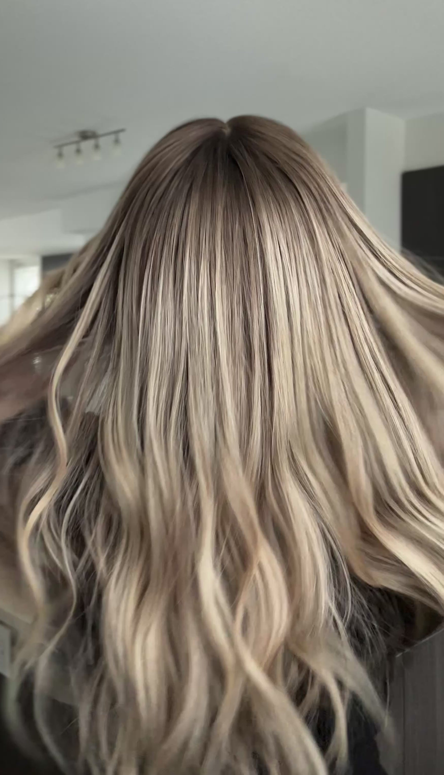 Level 7 soft root melt, champagne blond lengths with bright ends. Subtle dimension throughout.