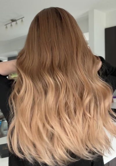 - Level 7/8 short root melt . Lengths are a Level 7 red base with a beautiful ombré fade to soft golden blond ends. Warm tones